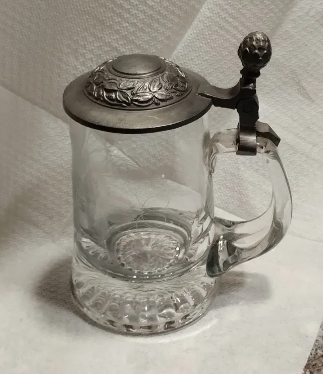 Dettagli del prodottoBoccale da birra in vetro con coperchio in peltro lavorato.