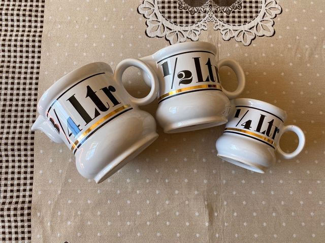 Boccali con misure prestabilite, molto utili in cucina e nel quotidiano. Sono in ceramica tedesca. Con dettagli in oro, molto eleganti