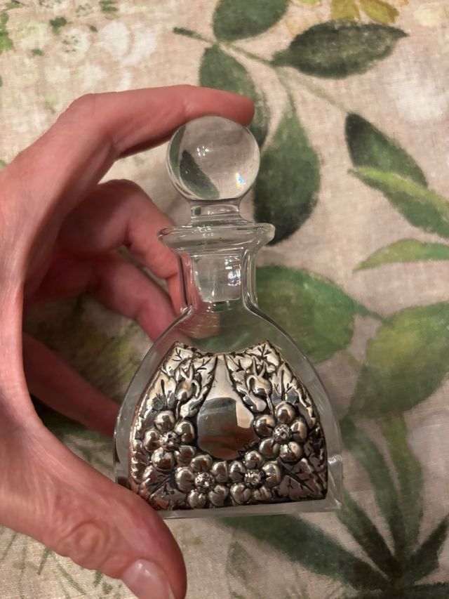 Elegante boccetta per profumi in vetro con dettagli in argento. - Decorazione floreale in argento. - Tappo in vetro sferico.
