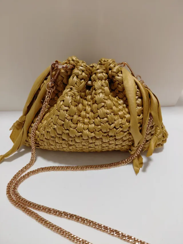 Borsa artigianale in edizione unica, con un design intrecciato che evoca l'eleganza. Finitura in oro. Catena metallica per portare a spalla o a tracolla. Chiusura superiore arricciata.