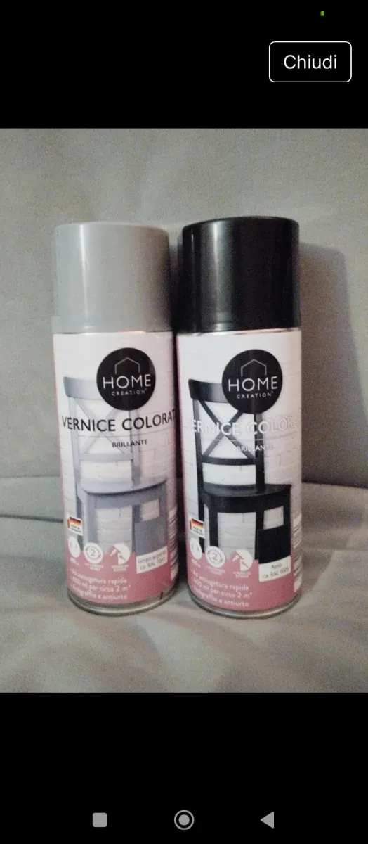 Due bombolette spray di vernice colorata Home Creation. - Una di colore nero. - Una di colore grigio argento. - Finitura brillante.