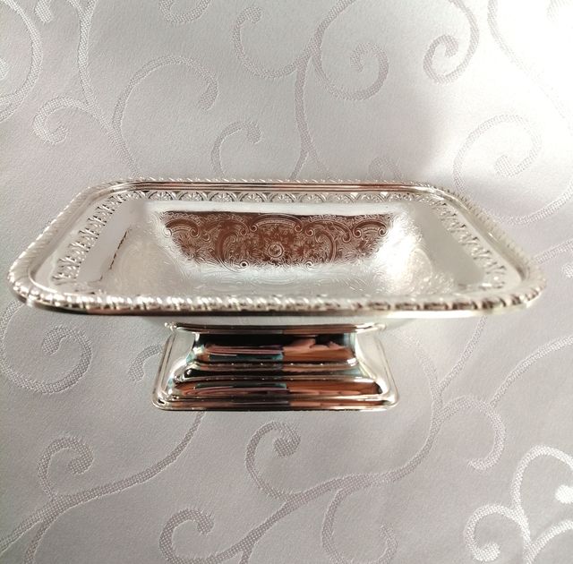 Dettagli del prodottoBomboniera silver plated Barker Ellis (anni ’30–’40), elegante pezzo inglese con bordo traforato, incisione floreale e piede rettangolare. Lavorazione di qualità tipica della storica argenteria Barker Ellis di Birmingham. Ideale come centrotavola o porta bonbon. Argentatura brillante, condizioni eccellenti. Misura: 15*12*6.