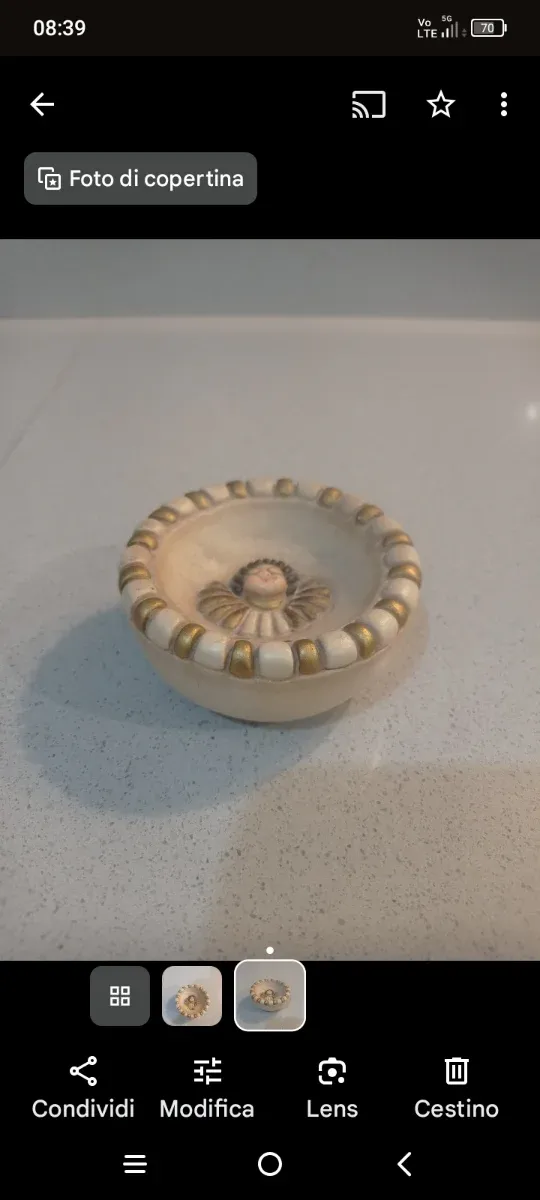 Dettagli del prodottoBomboniere Thun in ceramica, con decorazioni dorate e un piccolo angelo al centro. Ideale come idea regalo.
