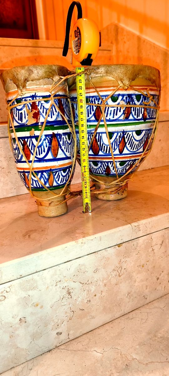 Dettagli del prodottoBellissimo paio di bongos marocchini artigianali. Sono decorati con colori vivaci e dettagli intricati. Perfetti per aggiungere un tocco esotico alla tua collezione di strumenti musicali o per decorare la tua casa.