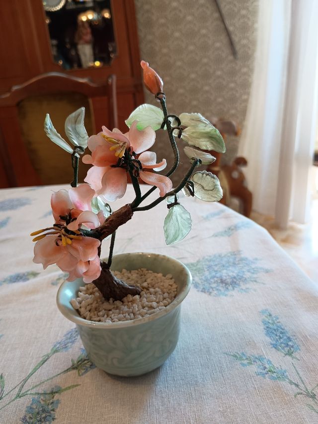 Dettagli del prodottoBellissimo bonsai in giada, raffigurante un albero di pesco in fiore. Un oggetto decorativo elegante e raffinato, perfetto per arredare la tua casa con un tocco di stile orientale.