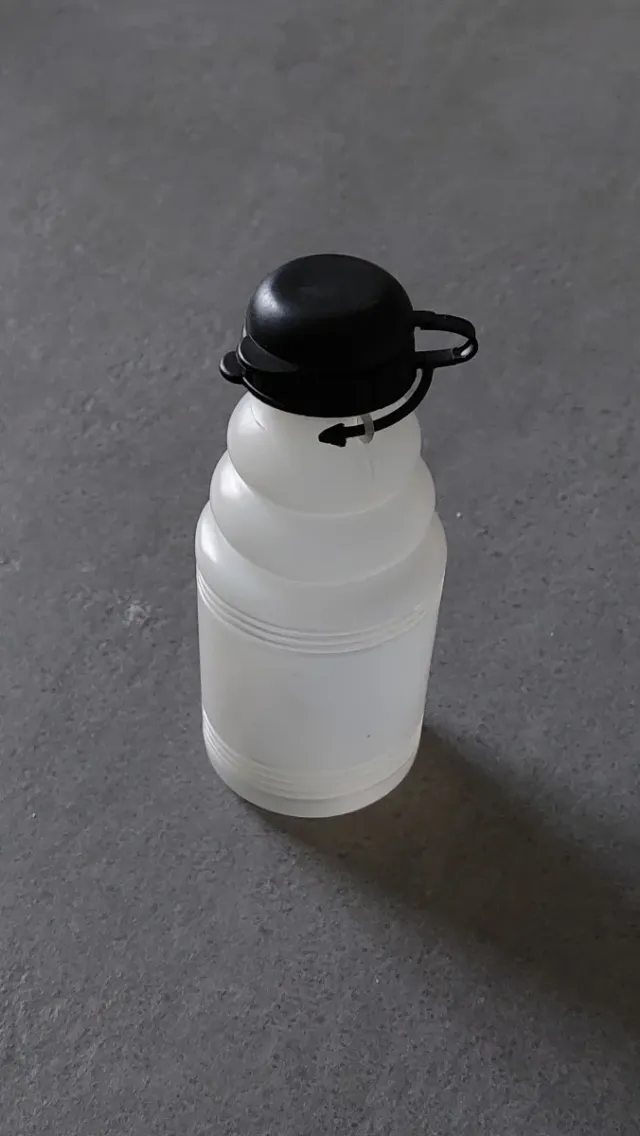 Piccola borraccia in plastica con tappo nero. - Design a coste. - Tappo con laccetto.