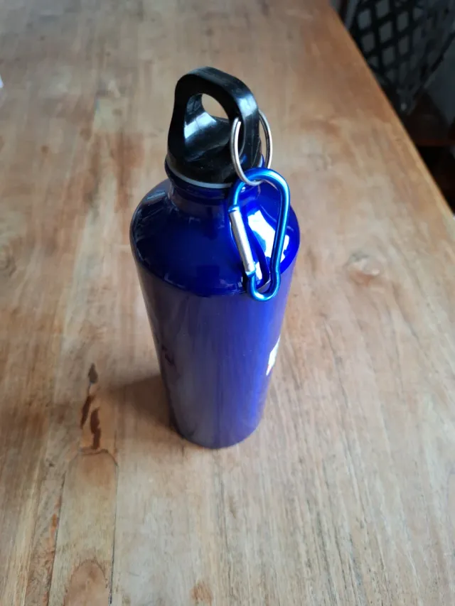 Borraccia termica in acciaio di colore blu. - Materiale: acciaio. - Colore: blu. - Include moschettone per aggancio.