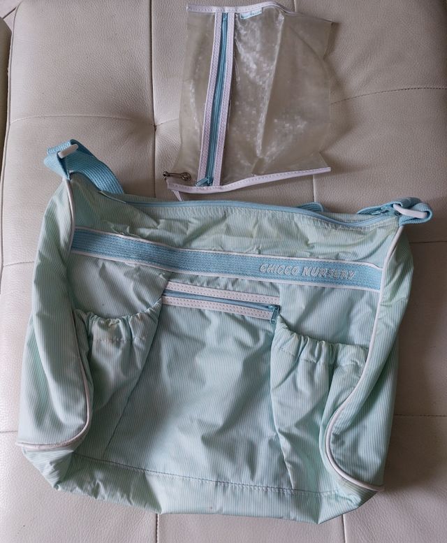 Dettagli del prodottoBorsa organizer Chicco Nursery con tasche davanti e dietro (un po' scucita la chiusura come da foto) e una busta interna trasparente con cerniera.