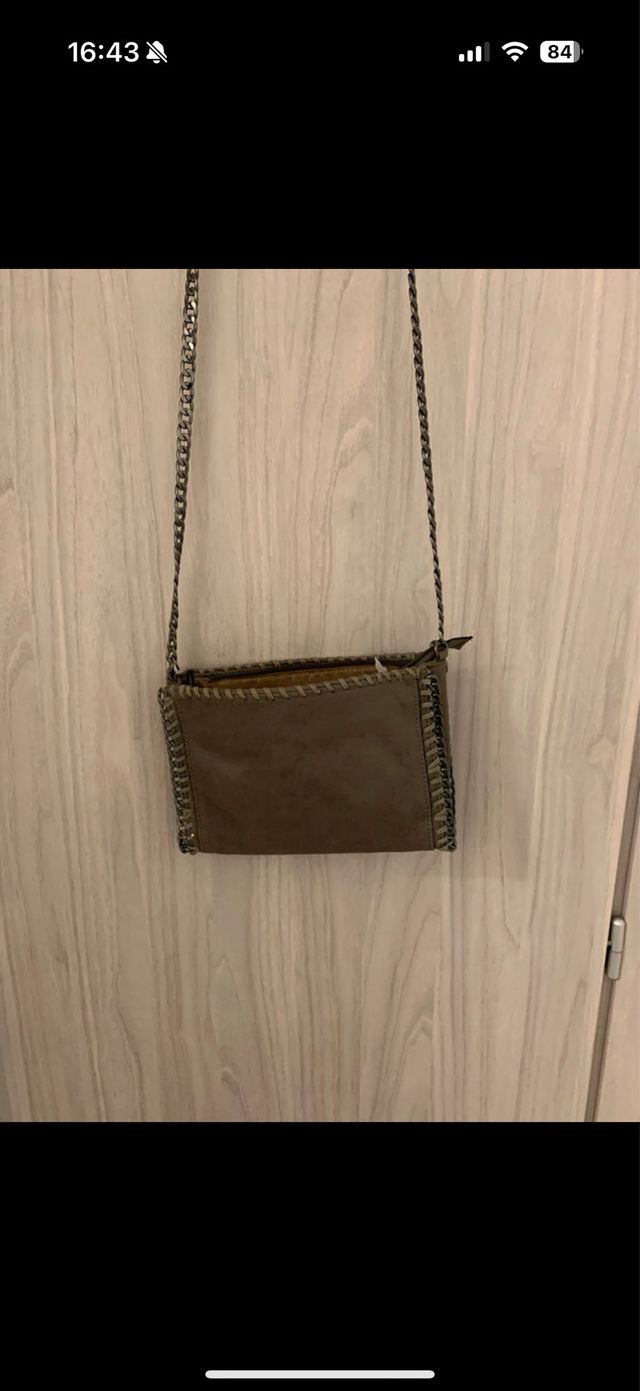 Borsa color tortora da usare sia con la tracolla sia con il laccetto da pochette