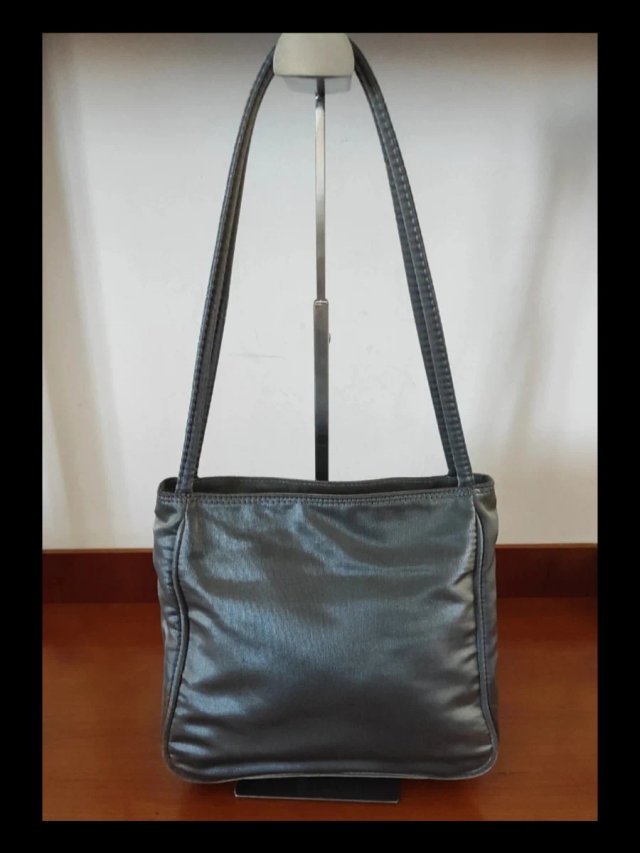Borda a spalla in tessuto grigio -argento, creazione Gianni Chiarini, in ottime condizioni, piccolo e irrilevante imperfezione alla base della borsa, dettagli e misure visibili in foto.