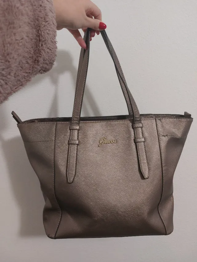 Borsa Originale Guess color bronzo. Misure: 38×28×16 cm. Cerniere perfettamente funzionanti. Compresa di sacchetta guess in tessuto.