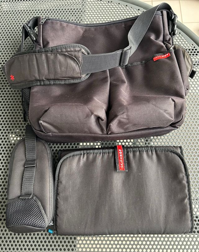 Dettagli del prodottoBorsa porta pannolini ben rifinita, ha due tasche anteriori con chiusura magnetica e due laterali una per il cellulare l’altra per borraccia o biberon. Internamente ha altre tasche per tenere tutto in ordine.Tessuto tecnico facilmente lavabile e resistente. Misura 33x11x35 cm. Comodo il sistema SkipHop di attacco al passeggino. Tracolla regolabile che si può sganciare. Fasciatoio da viaggio incluso.