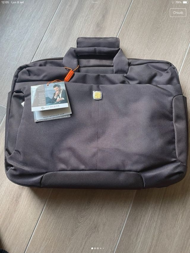 Borsa porta computer marrone con interni arancioni, tasche multiple per fogli e documenti, bretella per portarla in spalla all’interno. Adatta a laptop 15.6”.