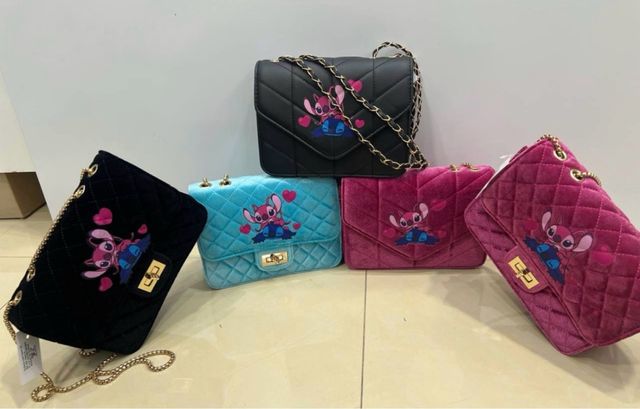 Borsa a tracolla con personaggio Stitch, realizzata in morbido velluto trapuntato.