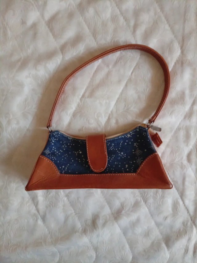 Borsetta artigianale con dettagli in denim e vero cuoio. Forma trapezoidale, jeans con brillantini. Chiusura con zip e con bottone metallico calamitato. Vintage in perfette condizioni. Dimensioni precise in foto 24x12 cm. Disponibile solo con spedizione.