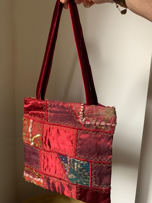 Dettagli del prodottoPiccola borsa in tessuti varii e paillettes bordeaxux. Manici in velluto bordeaux.Forma quadrata cm 22x22. La cerniera della chiusura non funzionante.
