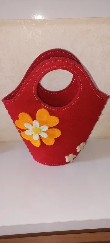 Dettagli del prodottoPiccola borsetta a secchiello realizzata in feltro rosso, decorata con applicazioni floreali.