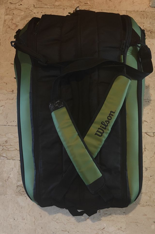 borsone da 12 racchette con 3 slot grandi e 2 laterali di cui uno con cerniera interna, portascarpe in testa. cerniere e bretelle PERFETTE