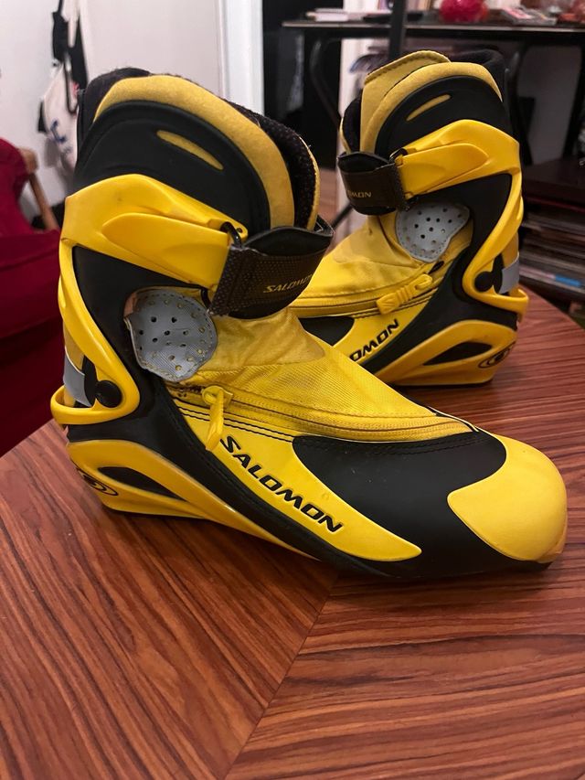 Dettagli del prodottoStivali da sci da fondo Salomon con sistema SNS Pilot. Progettati per offrire comfort e prestazioni sulla neve. Taglia 38. Poco usati. Colore giallo e nero. Chiusura con cerniera e velcro. Sistema di fissaggio SNS Pilot. La descrizione è stata tradotta automaticamente.