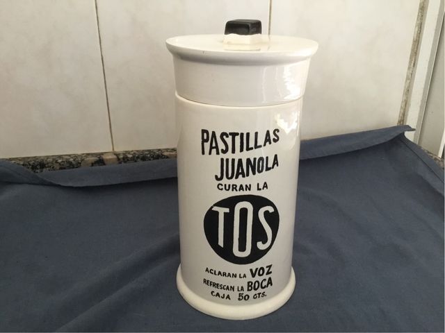 Dettagli del prodottoBottiglia in ceramica originale di pillole Juanola. Un oggetto decorativo dal design vintage.