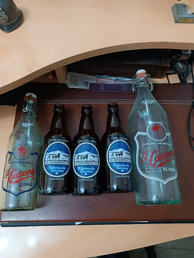 Dettagli del prodottoSet di cinque bottiglie in vetro, due di La Casera e tre di La Alhambra. - Bottiglia di La Casera con chiusura a leva. - Tre bottiglie di La Alhambra, tipo Pilsen, con etichette di Granada. - Bottiglia di La Casera con etichetta rossa e bianca. La descrizione è stata tradotta automaticamente.