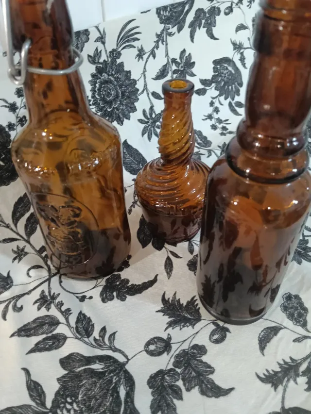 Dettagli del prodottoSet di bottiglie antiche in vetro ambra con un design vintage. - Bottiglia con chiusura a ribalta. - Bottiglia con corpo attorcigliato. - Bottiglia a collo largo. La descrizione è stata tradotta automaticamente.
