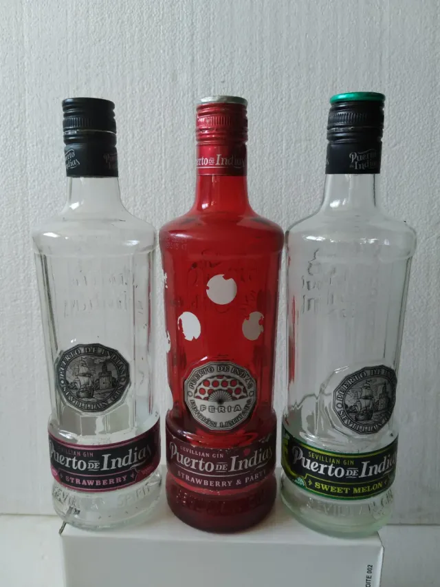 Tre bottiglie vuote di gin Puerto de Indias, perfette per collezionisti o per dare loro una seconda vita. - Bottiglia di gin Puerto de Indias al gusto di Fragola. - Bottiglia di gin Puerto de Indias al gusto di Melone. - Bottiglia di gin Puerto de Indias Edizione Limitata Fiera.