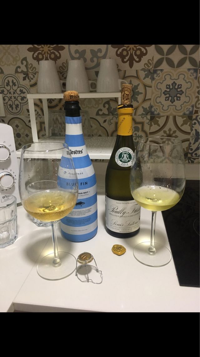 Due bottiglie di vino vuote, una di Cava Mestres Blue Fin e l'altra di Louis Latour Pouilly-Fuissé.