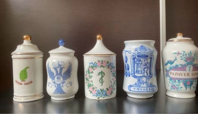 Dettagli del prodottoSet di dieci bottiglie o flaconi di porcellana per farmacia antichi, di Laboratorios ROCHE, risalenti al 1960. Ogni bottiglia presenta un design unico con decorazioni e nomi di farmaci antichi. - Bottiglia con foglia verde e testo Nicotiana Tabacum. - Bottiglia con aquila bicefala e corona. - Bottiglia con ghirlanda floreale e simbolo del caduceo. - Bottiglia con design blu e testo TOTAEPAL. - Bottiglia con pavone, fiori e testo Papaver Somn. Ogni bottiglia costa 14 euro, tranne una con il tappo attaccato a 8 euro. La descrizione è stata tradotta automaticamente.