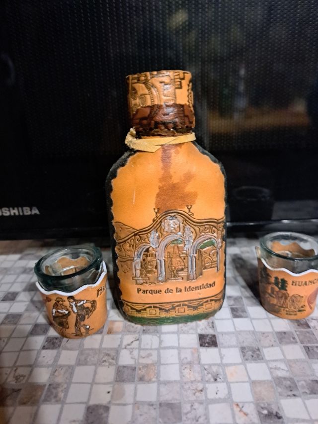 Dettagli del prodottobottiglia e bicchierini in vetro rivestimento in cuoio Misure del prodotto