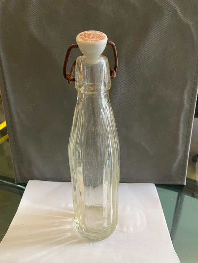 Bottiglia in vetro trasparente con chiusura a leva in ceramica e metallo. - Design vintage. - Marchio Roncarole visibile sulla chiusura.