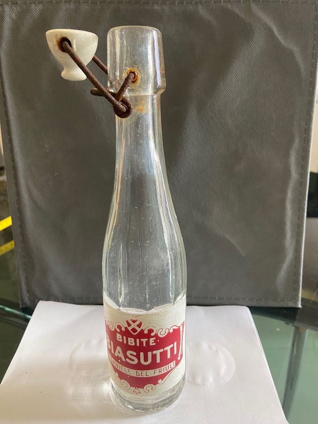 Dettagli del prodottoBottiglia in vetro trasparente con chiusura a scatto in ceramica e metallo.