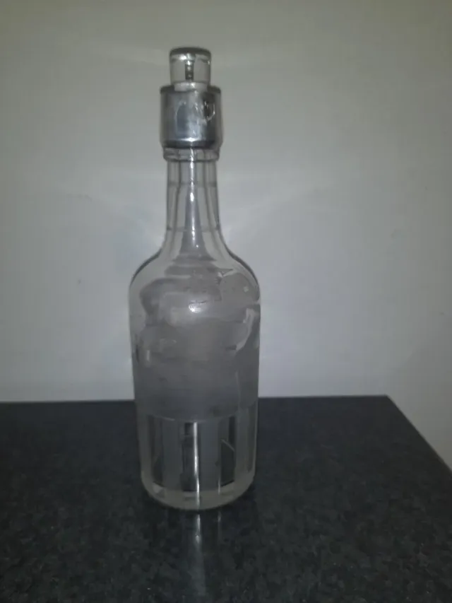 Il tappo originale è in cristallo, con parte inferiore in argento sterling, ma manca la copertura superiore e il lucchetto. Sulla base dell’argento è inciso “30 Hawkes Sterling”, confermando la manifattura e suggerendo una datazione agli anni ’30.