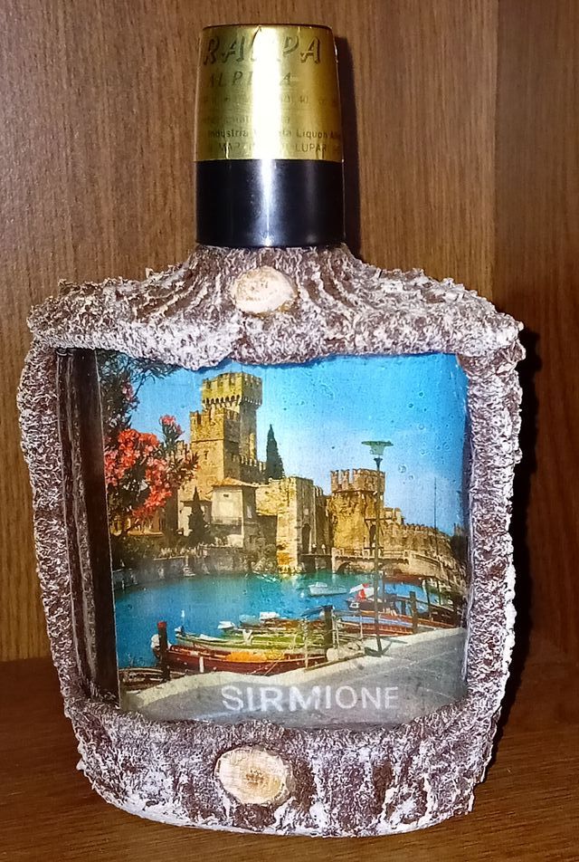 Dettagli del prodottoBottiglia mignon grappa di Sirmione dal design molto bello e particolare. La bottiglia è vuota, conteneva grappa alpina.