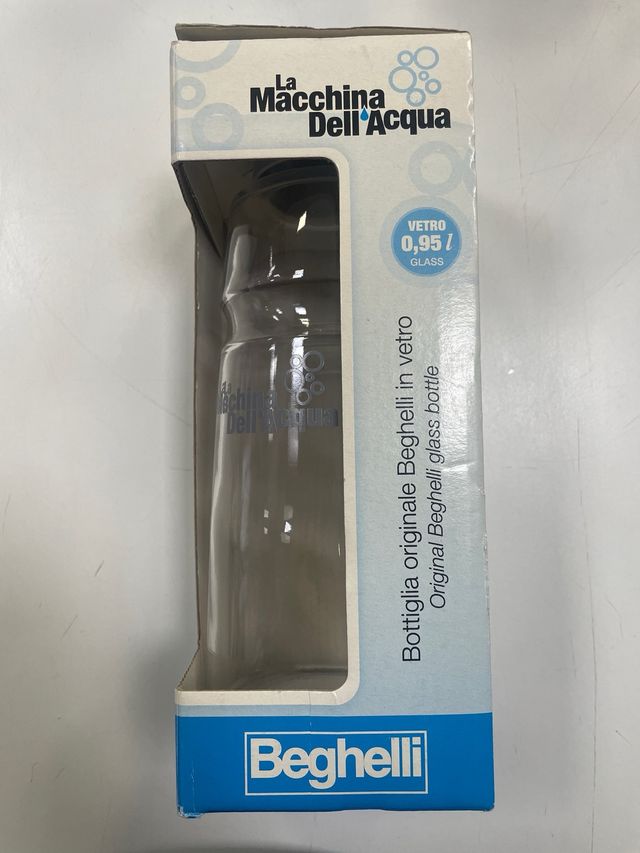 Dettagli del prodottovendo bottiglia vetro per macchina dell’acqua della Begheli. Nuova. Mai usata.