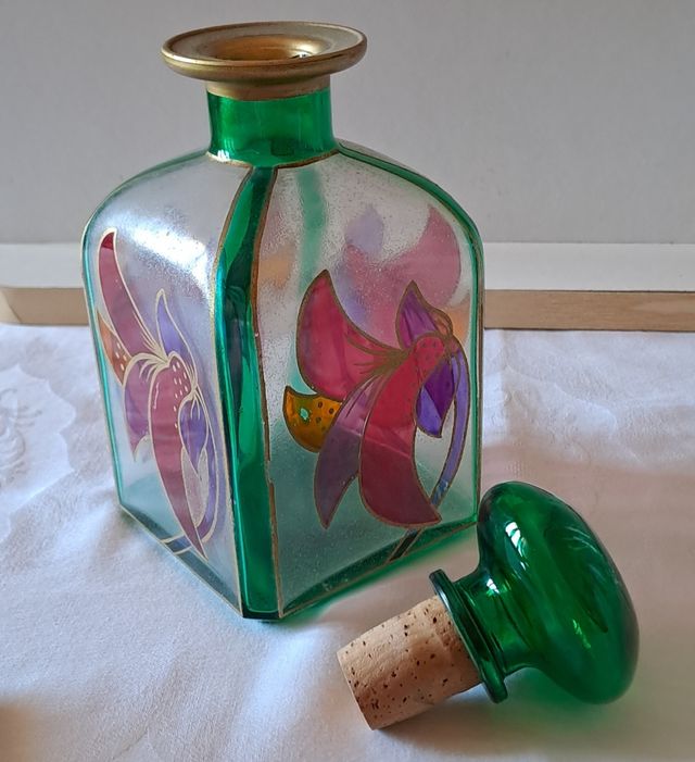 Dettagli del prodottoBellissima bottiglia vintage in vetro lavorato. Dipinta a mano. Perfetta per collezionisti o per un tocco di stile retrò in casa tua. Misure del prodotto