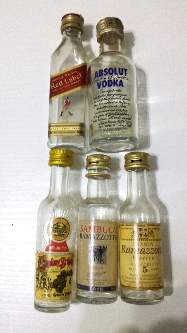 Lotto Di 5 Bottigliette Vuote Mignon Da Collezione In Vetro Absolut Vodka,Red Label Whisky ,Brandy Ramazzotti,Liquore Strega,Sambuca Ramazzotti Vendibili Anche Separatamente al prezzo di 6 euro cadauno,in lotto di 5 a 26 euro
