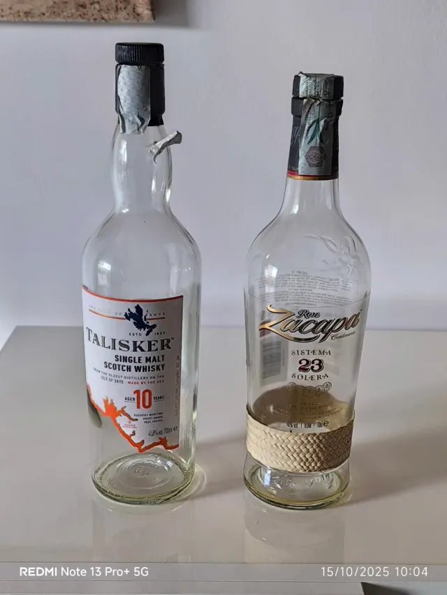 Vendesi due bottiglie vuote, una di Talisker Single Malt Scotch Whisky e una di Rum Zacapa. - Bottiglia Talisker 10 anni. - Bottiglia Zacapa 23 Solera.