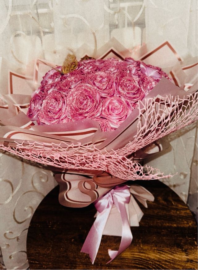Bellissimo bouquet di rose realizzate a mano con nastro di raso rosa scintillante. Un tocco di eleganza e romanticismo.