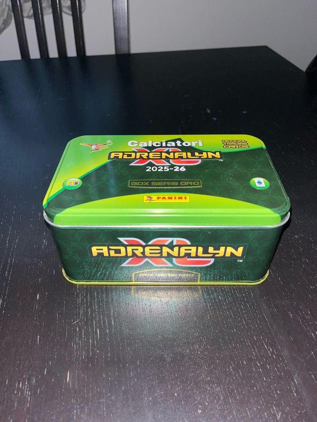 Box Serie Oro Panini Adrenalyn XL per la stagione 2025-26. - Contiene carte da collezione. - Edizione Box Serie Oro. - Marchio Panini.