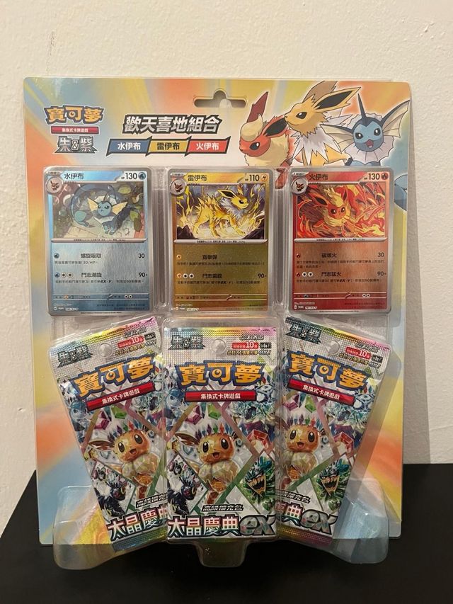 - Include 3 carte Pokémon: Vaporeon, Jolteon e Flareon.