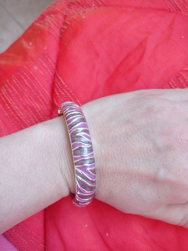 bracciale rigido con chiusura a scatto, colore verde oliva e rosa/ fucsia
