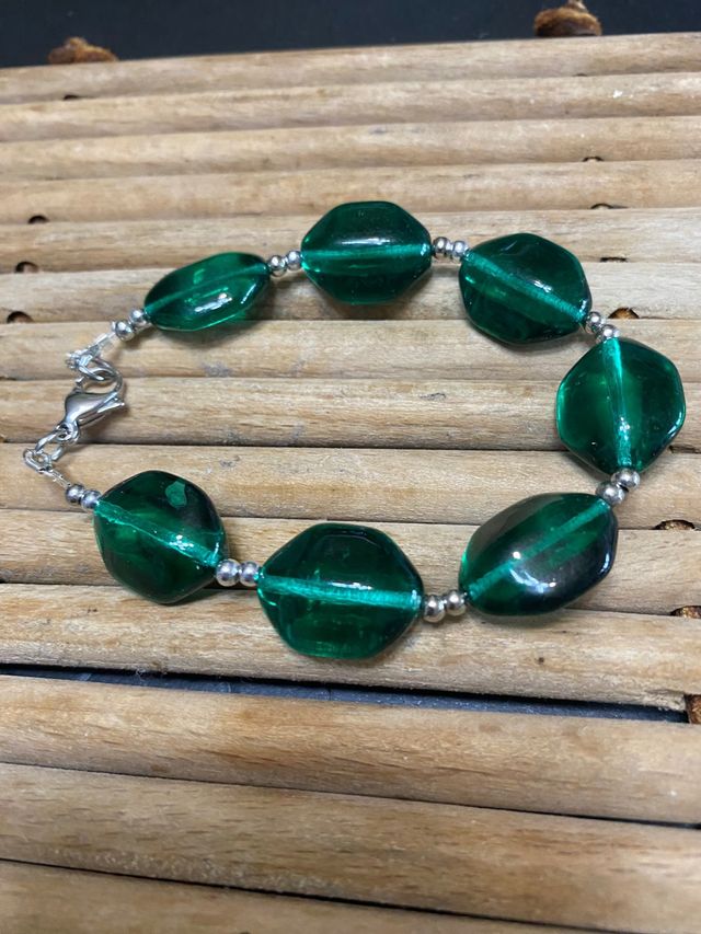 Bracciale realizzato a mano in vetro verde scuro moschettoni in acciaio nichel free lunghezza bracciale circa 20 cm