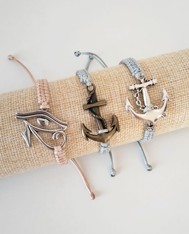 Bracciali in corda grigia e beige con centrale in metallo color argento e bronzo anticato, senza nichel e piombo.