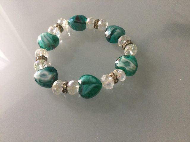 Dettagli del prodottoBracciale elastico con pietre dure verdi (malachite) a forma di cuori con sfaccettature e Swarovski trasparenti, la lavorazione della pietra da brillantezza ai vari pezzi, molto bello, usato poco. Adatto a tutti i tipi di polso