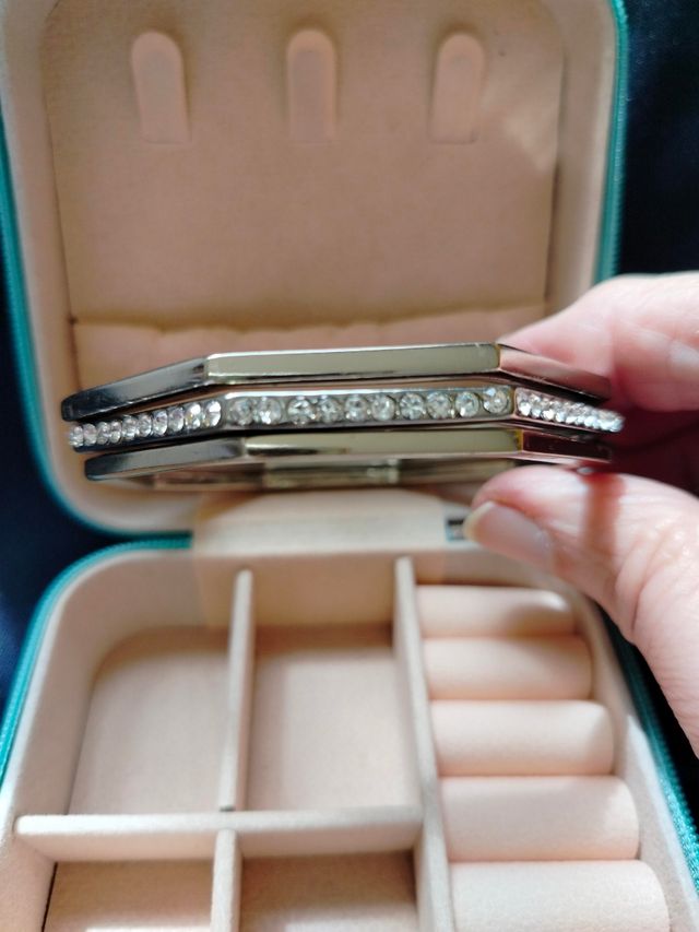 Tre bracciali, due in acciaio lisci, uno completamente ricoperto di strass. Pesano complessivamete 66 grammi. Vedi foto per la misura.