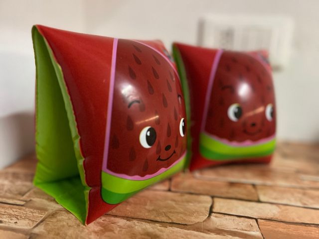 Dettagli del prodottoBraccioli gonfiabili a forma di fetta di anguria, perfetti per i più piccoli. Sono due braccioli colorati e allegri, ideali per imparare a nuotare in sicurezza. Sono in ottime condizioni.