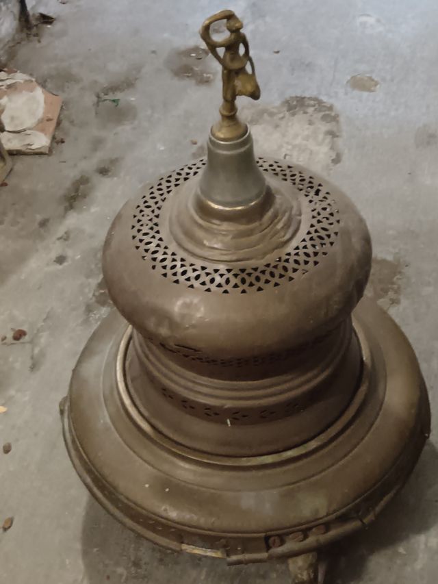 Dettagli del prodottoAntico bracere in ottone con decorazioni traforate e una statuetta sulla sommità. Un pezzo d'arredo unico.molto taro