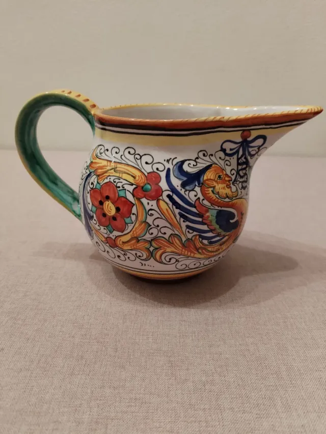 Ceramiche Deruta. Brocca da tavola in ceramica finemente decorata a mano. H 12 cm. L 15 cm.