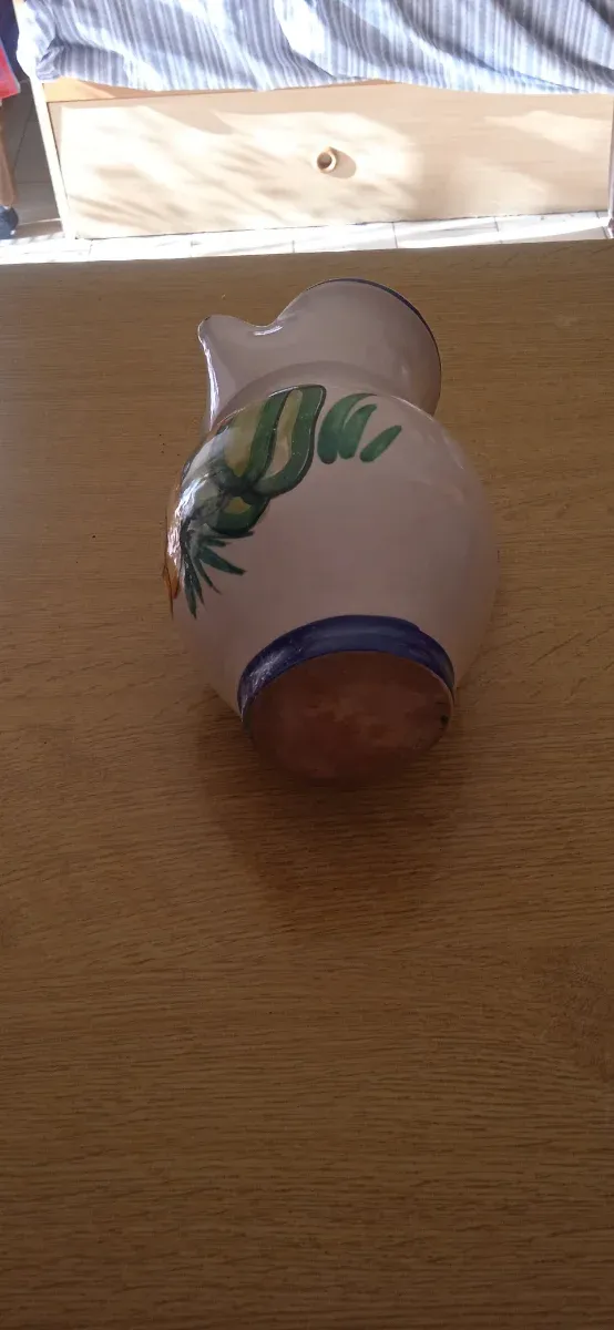 Brocca in ceramica con decorazioni floreali. - Design dipinto a mano. - Bordatura blu sul fondo.
